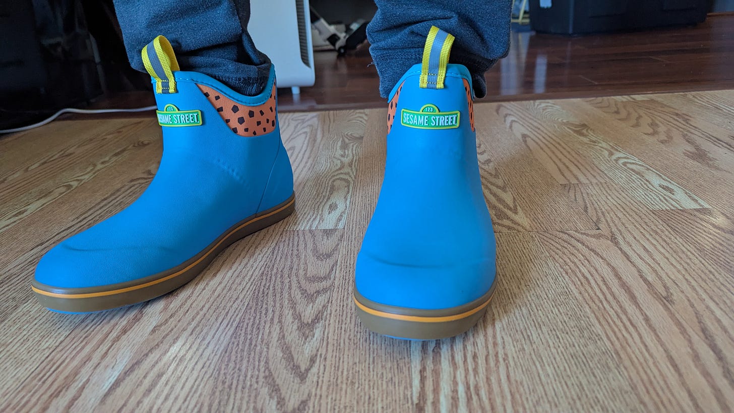 The brand wormed its way even deeper into my heart when Todd found it had a new Sesame Street collab. And they come in adult sizes! Just look at these Cookie Monster-themed boots he got as a birthday present!