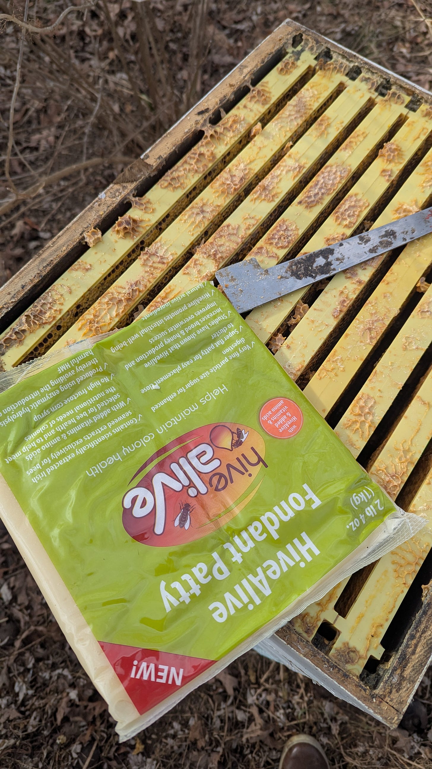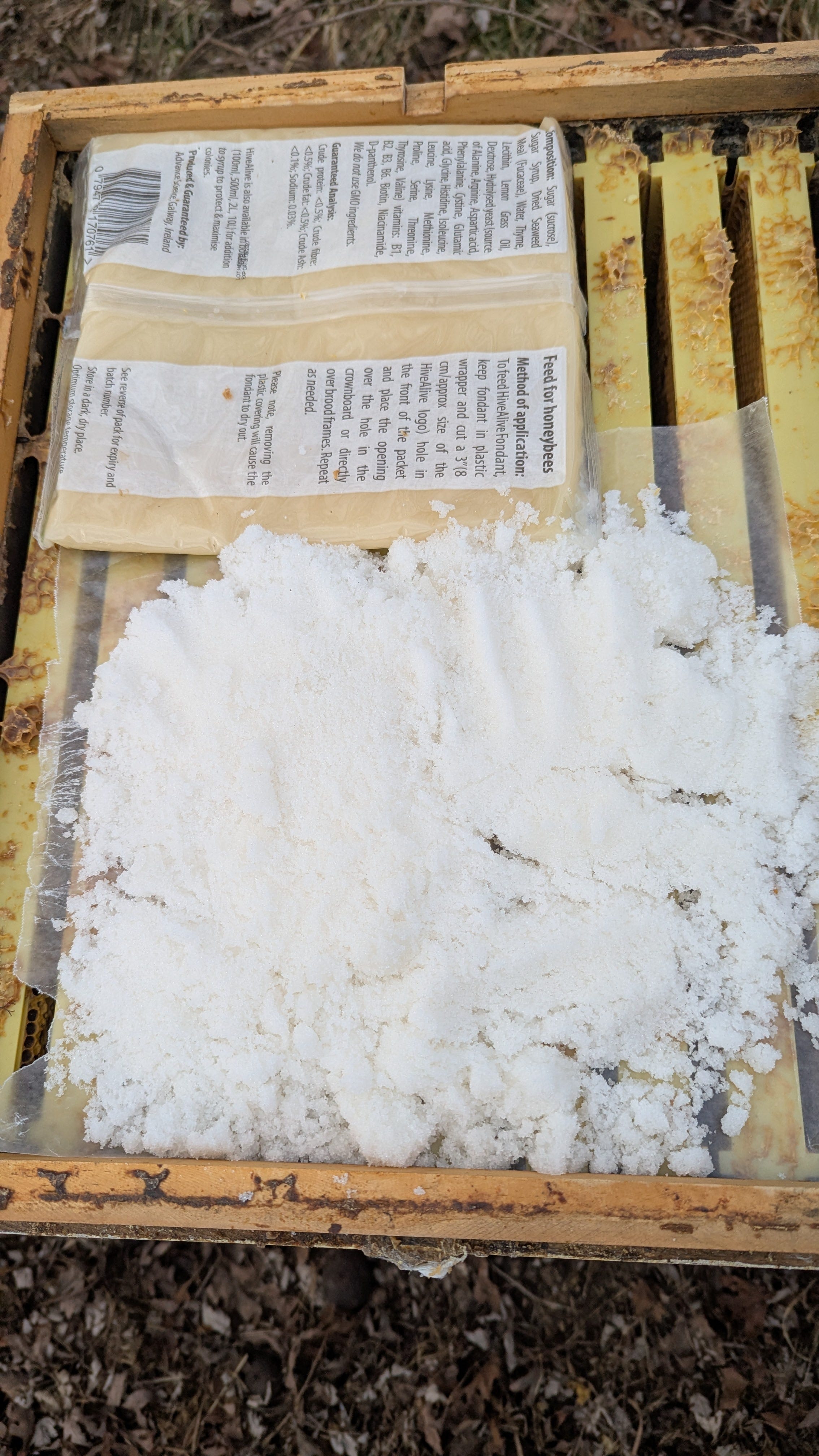 This year I’m trying these new fondant patties, which have vitamins and minerals added to the sugar. Because they’re expensive and not that big, I covered the rest of the box in my normal bee fondant recipe - a mix of sugar, water, and a tiny bit of white vinegar.
